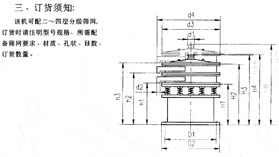 型 號 篩網(wǎng)直徑 (mm) 處理量 (T / h) 振動頻率 (min-1) 電機功率 (kw) 重量 (kg) 備 注 GD — 1500 ¢ 1500 9 — 14 930 2.2 759 處理量按標準物料河砂計算 (1.67/m3) 選型時按處理物料比 重換算 GD — 1000 ¢ 1000 4 — 6 930 1.I 500 GD — 800 ¢ 800 2 — 4 930 0.75 40 GD — 600 ¢ 600 1.5 — 2 1450 0.75 300 GD — 400 ¢ 400 1 — 1.5 1450 0.25 160